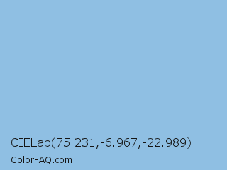 CIELab 75.231,-6.967,-22.989 Color is a light blue color and the nearest color is Pale Cerulean #9bc4e2. Hex code #8fbfe3 and RGB value is rgb(143,191,227). In RGB color space, this color is composed of 56% red, 75% green, 89% blue, In CMYK color space, this color is composed of 37% cyan, 16% magenta, 0% yellow , 11% black , In HSL color space, this color has a hue angle of 206° , 60% saturation and 73% lightness.