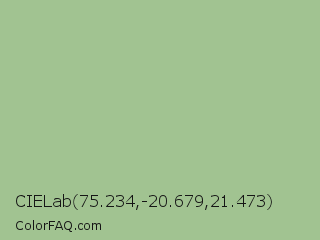 CIELab 75.234,-20.679,21.473 Color is a light green color and the nearest color is Swamp Green #acb78e. Hex code #a1c391 and RGB value is rgb(161,195,145). In RGB color space, this color is composed of 63% red, 76% green, 57% blue, In CMYK color space, this color is composed of 17% cyan, 0% magenta, 26% yellow , 24% black , In HSL color space, this color has a hue angle of 101° , 29% saturation and 67% lightness.