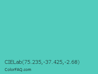 CIELab 75.235,-37.425,-2.68 Color is a normal cyan color and the nearest color is Medium Turquoise #48d1cc. Hex code #52ccbd and RGB value is rgb(82,204,189). In RGB color space, this color is composed of 32% red, 80% green, 74% blue, In CMYK color space, this color is composed of 60% cyan, 0% magenta, 7% yellow , 20% black , In HSL color space, this color has a hue angle of 173° , 54% saturation and 56% lightness.