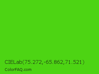 CIELab 75.272,-65.862,71.521 Color is a normal green color and the nearest color is Harlequin Green #46cb18. Hex code #4dd413 and RGB value is rgb(77,212,19). In RGB color space, this color is composed of 30% red, 83% green, 7% blue, In CMYK color space, this color is composed of 64% cyan, 0% magenta, 91% yellow , 17% black , In HSL color space, this color has a hue angle of 102° , 84% saturation and 45% lightness.