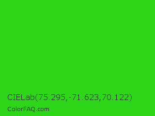 CIELab 75.295,-71.623,70.122 Color is a normal green color and the nearest color is Lime Green #32cd32. Hex code #2ed61a and RGB value is rgb(46,214,26). In RGB color space, this color is composed of 18% red, 84% green, 10% blue, In CMYK color space, this color is composed of 79% cyan, 0% magenta, 88% yellow , 16% black , In HSL color space, this color has a hue angle of 114° , 78% saturation and 47% lightness.