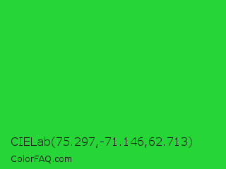 CIELab 75.297,-71.146,62.713 Color is a normal green color and the nearest color is Lime Green #32cd32. Hex code #25d636 and RGB value is rgb(37,214,54). In RGB color space, this color is composed of 15% red, 84% green, 21% blue, In CMYK color space, this color is composed of 83% cyan, 0% magenta, 75% yellow , 16% black , In HSL color space, this color has a hue angle of 126° , 71% saturation and 49% lightness.