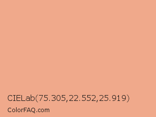 CIELab 75.305,22.552,25.919 Color is a light orange color and the nearest color is Tonys Pink #e79f8c. Hex code #f0a98b and RGB value is rgb(240,169,139). In RGB color space, this color is composed of 94% red, 66% green, 55% blue, In CMYK color space, this color is composed of 0% cyan, 30% magenta, 42% yellow , 6% black , In HSL color space, this color has a hue angle of 18° , 77% saturation and 74% lightness.