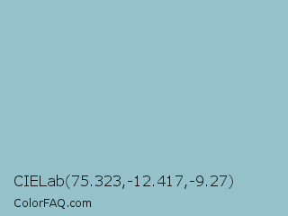 CIELab 75.323,-12.417,-9.27 Color is a light cyan color and the nearest color is Dark Sky Blue #8cbed6. Hex code #95c1ca and RGB value is rgb(149,193,202). In RGB color space, this color is composed of 58% red, 76% green, 79% blue, In CMYK color space, this color is composed of 26% cyan, 4% magenta, 0% yellow , 21% black , In HSL color space, this color has a hue angle of 190° , 33% saturation and 69% lightness.