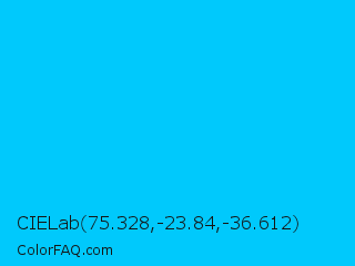 CIELab 75.328,-23.84,-36.612 Color is a normal cyan color and the nearest color is Vivid Sky Blue #00ccff. Hex code #00c9fc and RGB value is rgb(0,201,252). In RGB color space, this color is composed of 0% red, 79% green, 99% blue, In CMYK color space, this color is composed of 100% cyan, 20% magenta, 0% yellow , 1% black , In HSL color space, this color has a hue angle of 192° , 100% saturation and 49% lightness.