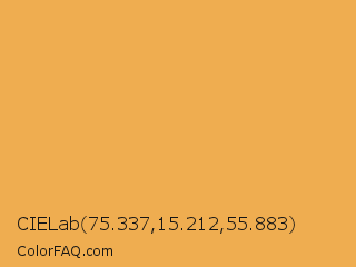 CIELab 75.337,15.212,55.883 Color is a light orange color and the nearest color is Sunray #e3ab57. Hex code #efad50 and RGB value is rgb(239,173,80). In RGB color space, this color is composed of 94% red, 68% green, 31% blue, In CMYK color space, this color is composed of 0% cyan, 28% magenta, 67% yellow , 6% black , In HSL color space, this color has a hue angle of 35° , 83% saturation and 63% lightness.