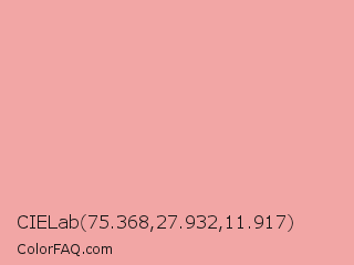 CIELab 75.368,27.932,11.917 Color is a light red color and the nearest color is Wewak #f19bab. Hex code #f2a6a5 and RGB value is rgb(242,166,165). In RGB color space, this color is composed of 95% red, 65% green, 65% blue, In CMYK color space, this color is composed of 0% cyan, 31% magenta, 32% yellow , 5% black , In HSL color space, this color has a hue angle of 1° , 75% saturation and 80% lightness.