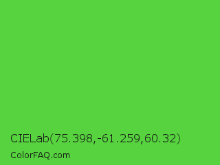 CIELab 75.398,-61.259,60.32 Color is a normal green color and the nearest color is Lime Green #32cd32. Hex code #56d33e and RGB value is rgb(86,211,62). In RGB color space, this color is composed of 34% red, 83% green, 24% blue, In CMYK color space, this color is composed of 59% cyan, 0% magenta, 71% yellow , 17% black , In HSL color space, this color has a hue angle of 110° , 63% saturation and 54% lightness.