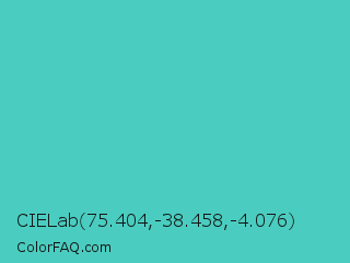 CIELab 75.404,-38.458,-4.076 Color is a normal cyan color and the nearest color is Medium Turquoise #48d1cc. Hex code #4acdc0 and RGB value is rgb(74,205,192). In RGB color space, this color is composed of 29% red, 80% green, 75% blue, In CMYK color space, this color is composed of 64% cyan, 0% magenta, 6% yellow , 20% black , In HSL color space, this color has a hue angle of 174° , 57% saturation and 55% lightness.