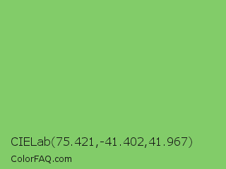 CIELab 75.421,-41.402,41.967 Color is a light green color and the nearest color is Mantis #74c365. Hex code #82cc69 and RGB value is rgb(130,204,105). In RGB color space, this color is composed of 51% red, 80% green, 41% blue, In CMYK color space, this color is composed of 36% cyan, 0% magenta, 49% yellow , 20% black , In HSL color space, this color has a hue angle of 105° , 49% saturation and 61% lightness.
