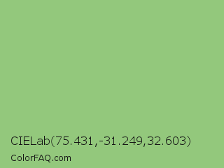 CIELab 75.431,-31.249,32.603 Color is a light green color and the nearest color is Pistachio #93c572. Hex code #93c87c and RGB value is rgb(147,200,124). In RGB color space, this color is composed of 58% red, 78% green, 49% blue, In CMYK color space, this color is composed of 27% cyan, 0% magenta, 38% yellow , 22% black , In HSL color space, this color has a hue angle of 102° , 41% saturation and 64% lightness.