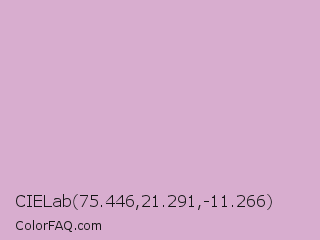 CIELab 75.446,21.291,-11.266 Color is a light magenta color and the nearest color is Pink Lavender #d8b2d1. Hex code #d8adcf and RGB value is rgb(216,173,207). In RGB color space, this color is composed of 85% red, 68% green, 81% blue, In CMYK color space, this color is composed of 0% cyan, 20% magenta, 4% yellow , 15% black , In HSL color space, this color has a hue angle of 313° , 36% saturation and 76% lightness.