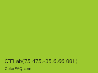 CIELab 75.475,-35.6,66.881 Color is a normal lime color and the nearest color is Yellow Green #9acd32. Hex code #9cc92e and RGB value is rgb(156,201,46). In RGB color space, this color is composed of 61% red, 79% green, 18% blue, In CMYK color space, this color is composed of 22% cyan, 0% magenta, 77% yellow , 21% black , In HSL color space, this color has a hue angle of 77° , 63% saturation and 48% lightness.