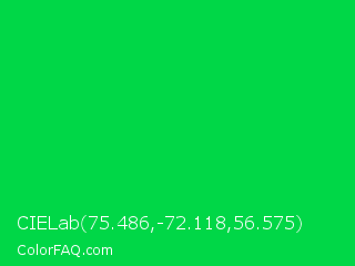 CIELab 75.486,-72.118,56.575 Color is a normal green color and the nearest color is Malachite #0bda51. Hex code #00d747 and RGB value is rgb(0,215,71). In RGB color space, this color is composed of 0% red, 84% green, 28% blue, In CMYK color space, this color is composed of 100% cyan, 0% magenta, 67% yellow , 16% black , In HSL color space, this color has a hue angle of 140° , 100% saturation and 42% lightness.