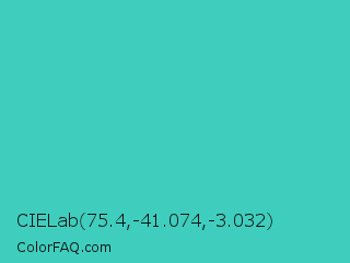CIELab 75.4,-41.074,-3.032 Color is a normal cyan color and the nearest color is Medium Turquoise #48d1cc. Hex code #3fcebe and RGB value is rgb(63,206,190). In RGB color space, this color is composed of 25% red, 81% green, 75% blue, In CMYK color space, this color is composed of 69% cyan, 0% magenta, 8% yellow , 19% black , In HSL color space, this color has a hue angle of 173° , 59% saturation and 53% lightness.