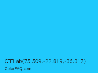 CIELab 75.509,-22.819,-36.317 Color is a normal blue color and the nearest color is Spiro Disco Ball #0fc0fc. Hex code #1fc9fc and RGB value is rgb(31,201,252). In RGB color space, this color is composed of 12% red, 79% green, 99% blue, In CMYK color space, this color is composed of 88% cyan, 20% magenta, 0% yellow , 1% black , In HSL color space, this color has a hue angle of 194° , 97% saturation and 55% lightness.