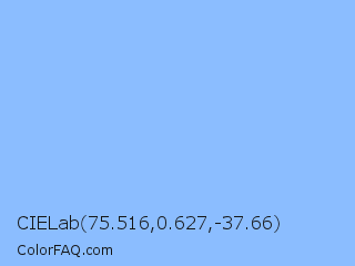CIELab 75.516,0.627,-37.66 Color is a light blue color and the nearest color is Jordy Blue #8ab9f1. Hex code #8bbdff and RGB value is rgb(139,189,255). In RGB color space, this color is composed of 55% red, 74% green, 100% blue, In CMYK color space, this color is composed of 45% cyan, 26% magenta, 0% yellow , 0% black , In HSL color space, this color has a hue angle of 214° , 100% saturation and 77% lightness.