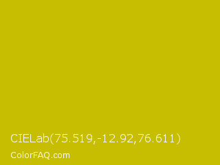 CIELab 75.519,-12.92,76.611 Color is a normal yellow color and the nearest color is Rio Grande #bbd009. Hex code #c8be01 and RGB value is rgb(200,190,1). In RGB color space, this color is composed of 78% red, 75% green, 0% blue, In CMYK color space, this color is composed of 0% cyan, 5% magenta, 100% yellow , 22% black , In HSL color space, this color has a hue angle of 57° , 99% saturation and 39% lightness.