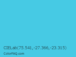 CIELab 75.541,-27.366,-23.315 Color is a normal cyan color and the nearest color is Sea Serpent #4bc7cf. Hex code #46cae4 and RGB value is rgb(70,202,228). In RGB color space, this color is composed of 27% red, 79% green, 89% blue, In CMYK color space, this color is composed of 69% cyan, 11% magenta, 0% yellow , 11% black , In HSL color space, this color has a hue angle of 190° , 75% saturation and 58% lightness.