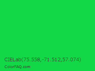 CIELab 75.558,-71.512,57.074 Color is a normal green color and the nearest color is Malachite #0bda51. Hex code #12d746 and RGB value is rgb(18,215,70). In RGB color space, this color is composed of 7% red, 84% green, 27% blue, In CMYK color space, this color is composed of 92% cyan, 0% magenta, 67% yellow , 16% black , In HSL color space, this color has a hue angle of 136° , 85% saturation and 46% lightness.