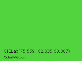 CIELab 75.559,-62.835,60.807 Color is a normal green color and the nearest color is Lime Green #32cd32. Hex code #51d43d and RGB value is rgb(81,212,61). In RGB color space, this color is composed of 32% red, 83% green, 24% blue, In CMYK color space, this color is composed of 62% cyan, 0% magenta, 71% yellow , 17% black , In HSL color space, this color has a hue angle of 112° , 64% saturation and 54% lightness.
