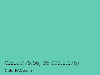 CIELab 75.56,-36.003,2.176 Color is a normal cyan color and the nearest color is Downy #6fd0c5. Hex code #63ccb5 and RGB value is rgb(99,204,181). In RGB color space, this color is composed of 39% red, 80% green, 71% blue, In CMYK color space, this color is composed of 51% cyan, 0% magenta, 11% yellow , 20% black , In HSL color space, this color has a hue angle of 167° , 51% saturation and 59% lightness.
