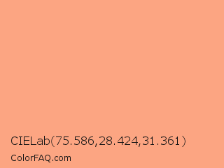 CIELab 75.586,28.424,31.361 Color is a light orange color and the nearest color is Hit Pink #ffab81. Hex code #fca582 and RGB value is rgb(252,165,130). In RGB color space, this color is composed of 99% red, 65% green, 51% blue, In CMYK color space, this color is composed of 0% cyan, 35% magenta, 48% yellow , 1% black , In HSL color space, this color has a hue angle of 17° , 95% saturation and 75% lightness.