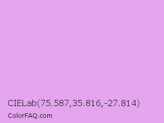 CIELab 75.587,35.816,-27.814 Color is a light magenta color and the nearest color is Medium Lavender Magenta #dda0dd. Hex code #e4a4ee and RGB value is rgb(228,164,238). In RGB color space, this color is composed of 89% red, 64% green, 93% blue, In CMYK color space, this color is composed of 4% cyan, 31% magenta, 0% yellow , 7% black , In HSL color space, this color has a hue angle of 292° , 69% saturation and 79% lightness.