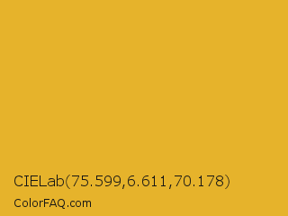 CIELab 75.599,6.611,70.178 Color is a normal orange color and the nearest color is Fuel Yellow #eca927. Hex code #e6b32b and RGB value is rgb(230,179,43). In RGB color space, this color is composed of 90% red, 70% green, 17% blue, In CMYK color space, this color is composed of 0% cyan, 22% magenta, 81% yellow , 10% black , In HSL color space, this color has a hue angle of 44° , 79% saturation and 54% lightness.