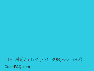 CIELab 75.631,-31.398,-22.682 Color is a normal cyan color and the nearest color is Scooter #2ebfd4. Hex code #2dcce3 and RGB value is rgb(45,204,227). In RGB color space, this color is composed of 18% red, 80% green, 89% blue, In CMYK color space, this color is composed of 80% cyan, 10% magenta, 0% yellow , 11% black , In HSL color space, this color has a hue angle of 188° , 76% saturation and 53% lightness.