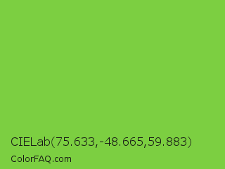 CIELab 75.633,-48.665,59.883 Color is a normal green color and the nearest color is Kiwi #8ee53f. Hex code #7ccf41 and RGB value is rgb(124,207,65). In RGB color space, this color is composed of 49% red, 81% green, 25% blue, In CMYK color space, this color is composed of 40% cyan, 0% magenta, 69% yellow , 19% black , In HSL color space, this color has a hue angle of 95° , 60% saturation and 53% lightness.