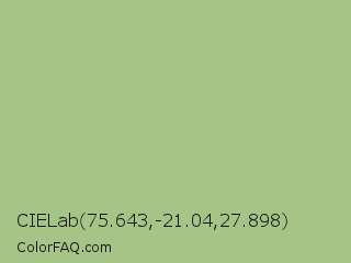CIELab 75.643,-21.04,27.898 Color is a light green color and the nearest color is Swamp Green #acb78e. Hex code #a6c486 and RGB value is rgb(166,196,134). In RGB color space, this color is composed of 65% red, 77% green, 53% blue, In CMYK color space, this color is composed of 15% cyan, 0% magenta, 32% yellow , 23% black , In HSL color space, this color has a hue angle of 89° , 34% saturation and 65% lightness.