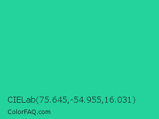 CIELab 75.645,-54.955,16.031 Color is a normal green color and the nearest color is Shamrock #33cc99. Hex code #23d39b and RGB value is rgb(35,211,155). In RGB color space, this color is composed of 14% red, 83% green, 61% blue, In CMYK color space, this color is composed of 83% cyan, 0% magenta, 27% yellow , 17% black , In HSL color space, this color has a hue angle of 161° , 72% saturation and 48% lightness.