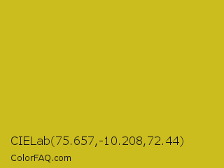 CIELab 75.657,-10.208,72.44 Color is a normal yellow color and the nearest color is Key Lime Pie #bfc921. Hex code #ccbd1f and RGB value is rgb(204,189,31). In RGB color space, this color is composed of 80% red, 74% green, 12% blue, In CMYK color space, this color is composed of 0% cyan, 7% magenta, 85% yellow , 20% black , In HSL color space, this color has a hue angle of 55° , 74% saturation and 46% lightness.