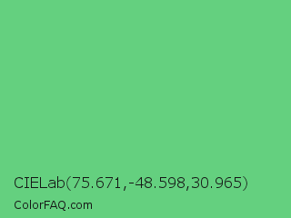 CIELab 75.671,-48.598,30.965 Color is a normal green color and the nearest color is Emerald #50c878. Hex code #64d07f and RGB value is rgb(100,208,127). In RGB color space, this color is composed of 39% red, 82% green, 50% blue, In CMYK color space, this color is composed of 52% cyan, 0% magenta, 39% yellow , 18% black , In HSL color space, this color has a hue angle of 135° , 53% saturation and 60% lightness.