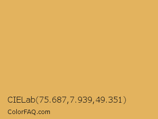CIELab 75.687,7.939,49.351 Color is a light orange color and the nearest color is Earth Yellow #e1a95f. Hex code #e3b35e and RGB value is rgb(227,179,94). In RGB color space, this color is composed of 89% red, 70% green, 37% blue, In CMYK color space, this color is composed of 0% cyan, 21% magenta, 59% yellow , 11% black , In HSL color space, this color has a hue angle of 38° , 70% saturation and 63% lightness.