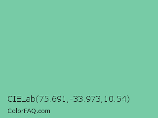 CIELab 75.691,-33.973,10.54 Color is a light green color and the nearest color is Medium Aquamarine #66ddaa. Hex code #77cba6 and RGB value is rgb(119,203,166). In RGB color space, this color is composed of 47% red, 80% green, 65% blue, In CMYK color space, this color is composed of 41% cyan, 0% magenta, 18% yellow , 20% black , In HSL color space, this color has a hue angle of 154° , 45% saturation and 63% lightness.