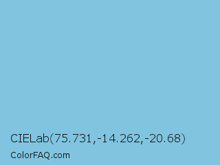 CIELab 75.731,-14.262,-20.68 Color is a light blue color and the nearest color is Seagull #80ccea. Hex code #80c4e0 and RGB value is rgb(128,196,224). In RGB color space, this color is composed of 50% red, 77% green, 88% blue, In CMYK color space, this color is composed of 43% cyan, 13% magenta, 0% yellow , 12% black , In HSL color space, this color has a hue angle of 198° , 61% saturation and 69% lightness.