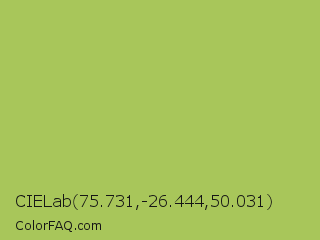 CIELab 75.731,-26.444,50.031 Color is a normal lime color and the nearest color is Middle Green Yellow #acbf60. Hex code #a8c65a and RGB value is rgb(168,198,90). In RGB color space, this color is composed of 66% red, 78% green, 35% blue, In CMYK color space, this color is composed of 15% cyan, 0% magenta, 55% yellow , 22% black , In HSL color space, this color has a hue angle of 77° , 49% saturation and 56% lightness.