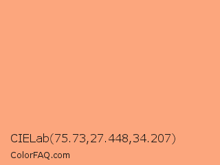 CIELab 75.73,27.448,34.207 Color is a light orange color and the nearest color is Hit Pink #ffab81. Hex code #fca67d and RGB value is rgb(252,166,125). In RGB color space, this color is composed of 99% red, 65% green, 49% blue, In CMYK color space, this color is composed of 0% cyan, 34% magenta, 50% yellow , 1% black , In HSL color space, this color has a hue angle of 19° , 95% saturation and 74% lightness.