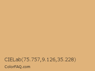 CIELab 75.757,9.126,35.228 Color is a light orange color and the nearest color is Harvest Gold #e0b974. Hex code #e0b37a and RGB value is rgb(224,179,122). In RGB color space, this color is composed of 88% red, 70% green, 48% blue, In CMYK color space, this color is composed of 0% cyan, 20% magenta, 46% yellow , 12% black , In HSL color space, this color has a hue angle of 34° , 62% saturation and 68% lightness.