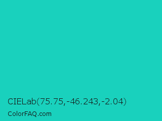 CIELab 75.75,-46.243,-2.04 Color is a normal cyan color and the nearest color is Java #1fc2c2. Hex code #19d1bd and RGB value is rgb(25,209,189). In RGB color space, this color is composed of 10% red, 82% green, 74% blue, In CMYK color space, this color is composed of 88% cyan, 0% magenta, 10% yellow , 18% black , In HSL color space, this color has a hue angle of 173° , 79% saturation and 46% lightness.