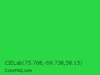CIELab 75.768,-69.738,58.15 Color is a normal green color and the nearest color is Lime Green #32cd32. Hex code #2ad744 and RGB value is rgb(42,215,68). In RGB color space, this color is composed of 16% red, 84% green, 27% blue, In CMYK color space, this color is composed of 80% cyan, 0% magenta, 68% yellow , 16% black , In HSL color space, this color has a hue angle of 129° , 68% saturation and 50% lightness.