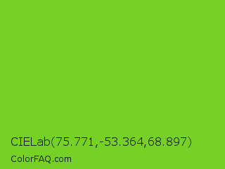 CIELab 75.771,-53.364,68.897 Color is a normal green color and the nearest color is Lima #76bd17. Hex code #75d125 and RGB value is rgb(117,209,37). In RGB color space, this color is composed of 46% red, 82% green, 15% blue, In CMYK color space, this color is composed of 44% cyan, 0% magenta, 82% yellow , 18% black , In HSL color space, this color has a hue angle of 92° , 70% saturation and 48% lightness.