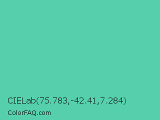 CIELab 75.783,-42.41,7.284 Color is a normal green color and the nearest color is Eucalyptus #44d7a8. Hex code #55cfac and RGB value is rgb(85,207,172). In RGB color space, this color is composed of 33% red, 81% green, 67% blue, In CMYK color space, this color is composed of 59% cyan, 0% magenta, 17% yellow , 19% black , In HSL color space, this color has a hue angle of 163° , 56% saturation and 57% lightness.
