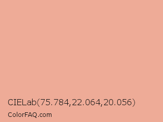 CIELab 75.784,22.064,20.056 Color is a light red color and the nearest color is Tonys Pink #e79f8c. Hex code #eeab97 and RGB value is rgb(238,171,151). In RGB color space, this color is composed of 93% red, 67% green, 59% blue, In CMYK color space, this color is composed of 0% cyan, 28% magenta, 37% yellow , 7% black , In HSL color space, this color has a hue angle of 14° , 72% saturation and 76% lightness.