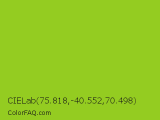 CIELab 75.818,-40.552,70.498 Color is a normal green color and the nearest color is Atlantis #97cd2d. Hex code #94cc21 and RGB value is rgb(148,204,33). In RGB color space, this color is composed of 58% red, 80% green, 13% blue, In CMYK color space, this color is composed of 27% cyan, 0% magenta, 84% yellow , 20% black , In HSL color space, this color has a hue angle of 80° , 72% saturation and 46% lightness.