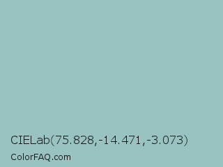 CIELab 75.828,-14.471,-3.073 Color is a light cyan color and the nearest color is Shadow Green #9ac2b8. Hex code #99c3c0 and RGB value is rgb(153,195,192). In RGB color space, this color is composed of 60% red, 76% green, 75% blue, In CMYK color space, this color is composed of 22% cyan, 0% magenta, 2% yellow , 24% black , In HSL color space, this color has a hue angle of 176° , 26% saturation and 68% lightness.