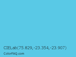 CIELab 75.829,-23.354,-23.907 Color is a light cyan color and the nearest color is Viking #64ccdb. Hex code #59c9e6 and RGB value is rgb(89,201,230). In RGB color space, this color is composed of 35% red, 79% green, 90% blue, In CMYK color space, this color is composed of 61% cyan, 13% magenta, 0% yellow , 10% black , In HSL color space, this color has a hue angle of 192° , 74% saturation and 63% lightness.