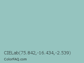 CIELab 75.842,-16.434,-2.539 Color is a light cyan color and the nearest color is Shadow Green #9ac2b8. Hex code #95c4bf and RGB value is rgb(149,196,191). In RGB color space, this color is composed of 58% red, 77% green, 75% blue, In CMYK color space, this color is composed of 24% cyan, 0% magenta, 3% yellow , 23% black , In HSL color space, this color has a hue angle of 174° , 28% saturation and 68% lightness.